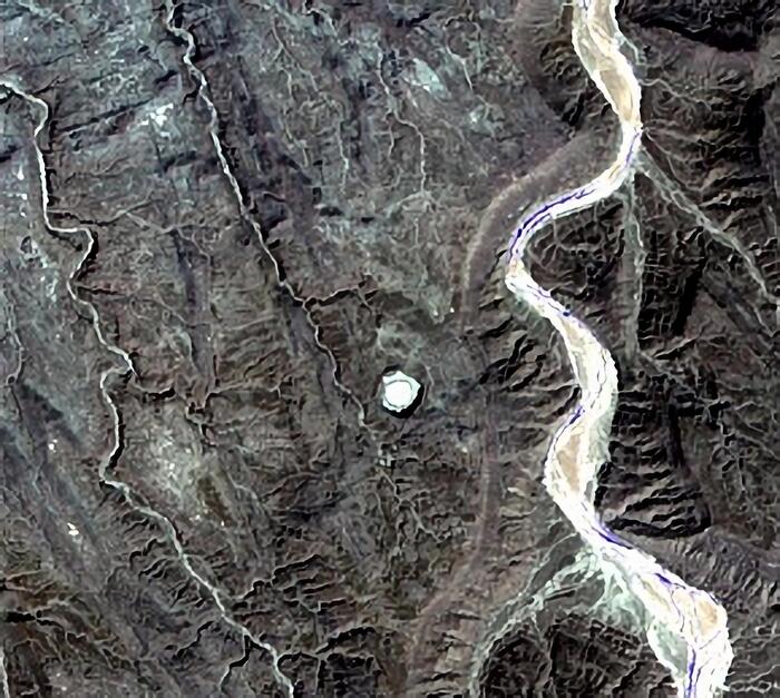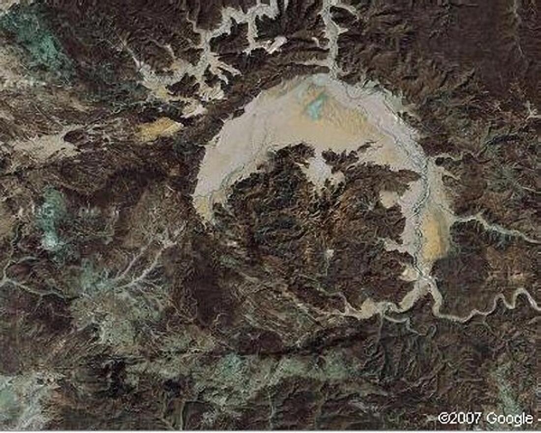 At its centre, rock peaks resemble the central uplift sometimes found in meteorite craters:
