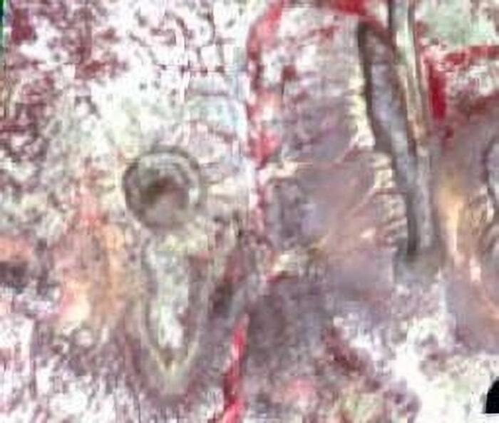 Note the meandering landform (digitally processed to red and apparently disrupted near Gogui Crater) and the strange shaped landform superimposed upon it at upper right.