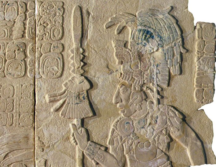It would be too easy to use Lady K'awiil Ajaw's PPE to illustrate this. So instead, here's a panel from Palenque, Mexico, showing the elaborate head-dresses associated with central American warrior-kings: